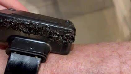 A inspeção técnica identificou sinais claros de avaria por queimadura ao redor de toda a circunferência da tornozeleira, especialmente na área de fechamento do case.
