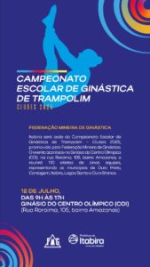 A Prefeitura de Itabira, por meio da Secretaria Municipal de Esporte e Lazer, sedia neste sábado (12/7) o Campeonato Escolar de Ginástica de Trampolim – Clubes 2025, promovido pela Federação Mineira de Ginástica. A competição será realizada das 9h às 17h, no Centro Olímpico de Itabira (COI), reunindo cerca de 170 atletas de cinco equipes, representantes dos municípios de Itabira, Ouro Preto, Ouro Branco, Itabirito e Contagem.