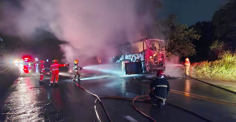 Um ônibus pegou fogo após se envolver em um acidente com uma motocicleta na altura do km 441, em Sabará, na Região Metropolitana de Belo Horizonte, na noite de domingo (04/01). Com o impacto da batida, a moto ficou presa embaixo do coletivo, iniciando o incêndio que atingiu o veículo de maior porte.